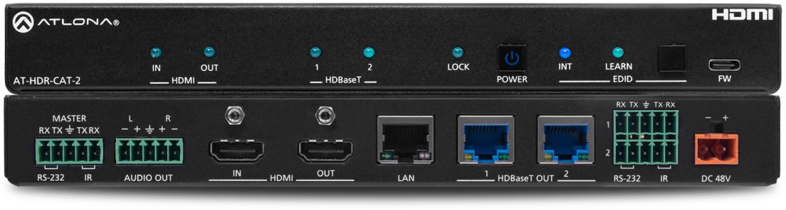 The HDR-CAT-2 is part of a family of 4K HDR HDMI to HDBaseT distribution amplifiers that also includes the HDR-CAT-4 four output, HDR-CAT-8 eight output, and HDR-CAT-4ED four output extended distance models.