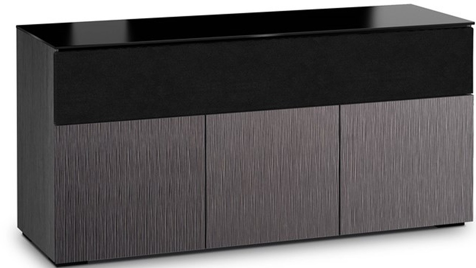 The light look and feel of tall grasses is finely set in a vertical textured pattern. Alpi gray oak with black glass top and black feet work in unison, creating the cabinet's hi-tech facade.