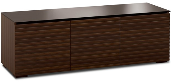 This sleek, streamlined design features a horizontal pattern on opium brown wood with a black glass top and wood block feet. Features Infinitely adjustable, black interior shelves. Built-in ventilation louvers for better air flow keep equipment cool.